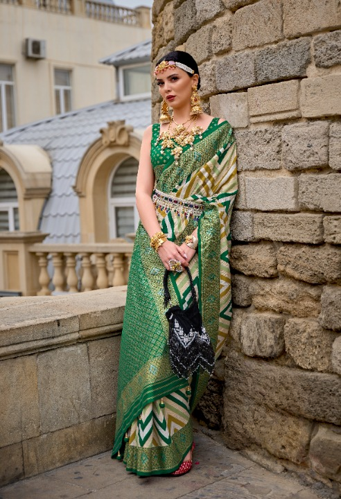 Green Banarasi Silk Saree With Chevron Stripes