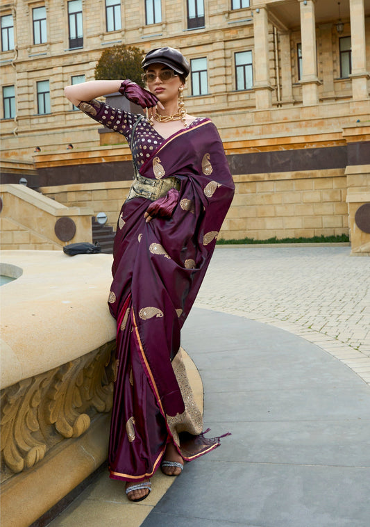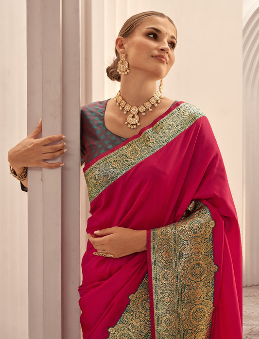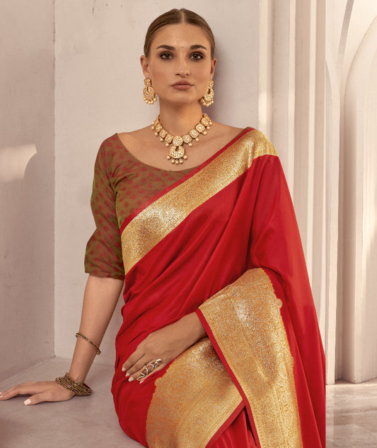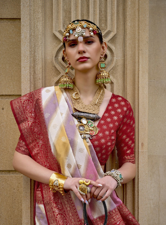 Red Hue Banarasi Silk Saree With Pastel Shaded Stripes