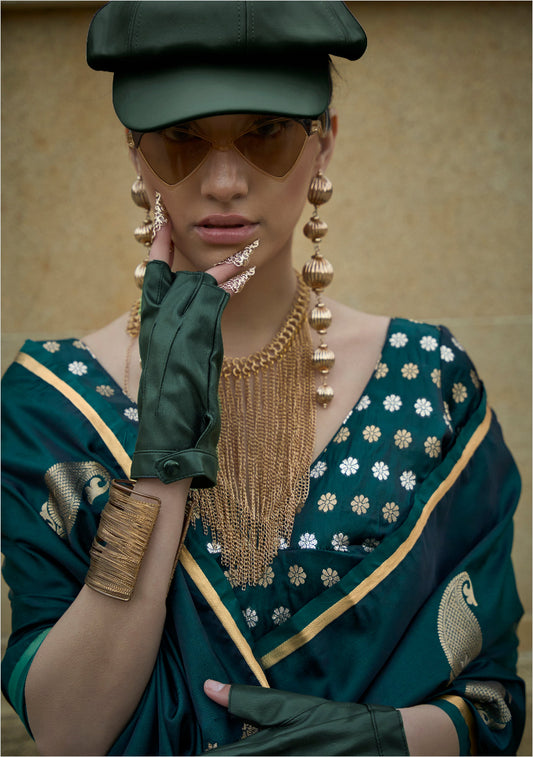 Forest Green Tissue Silk Saree With Embroidered Designer Blouse