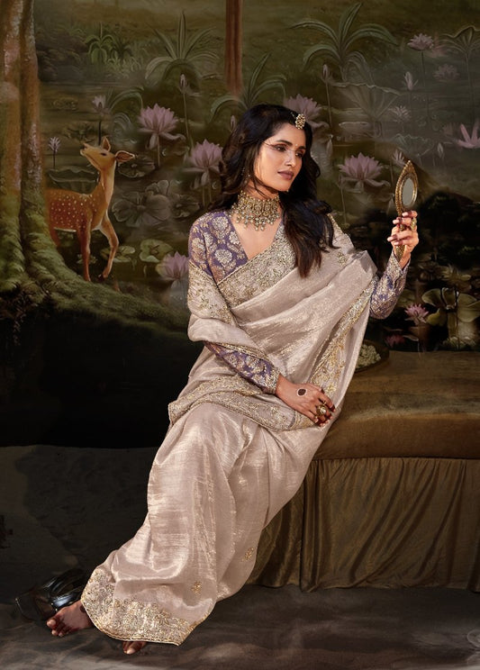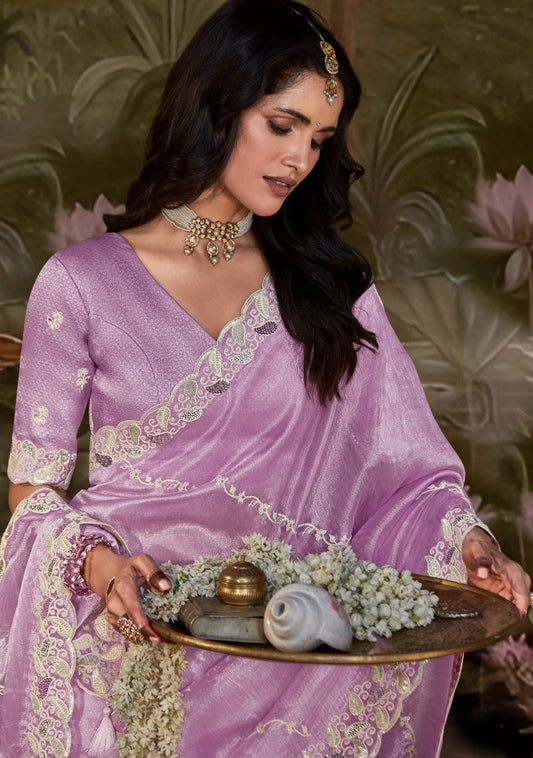 Light Purple Tissue Silk Saree With Embroidered Designer Blouse