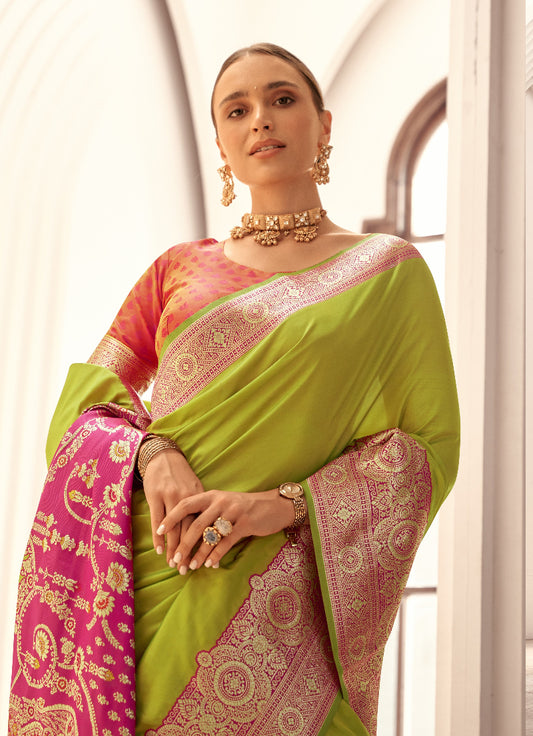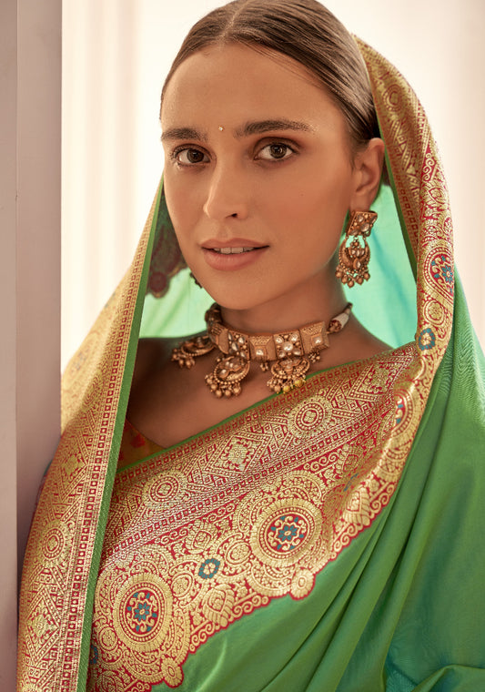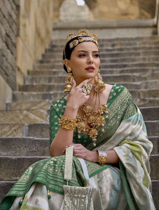 Green Banarasi Silk Saree With Pastel Shaded Stripes