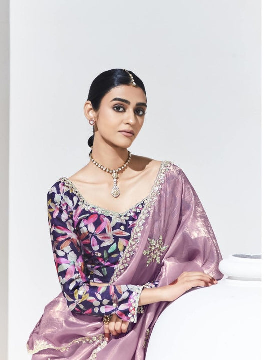 Pastel Mauve Crush Tissue Silk Saree With Designer Blouse