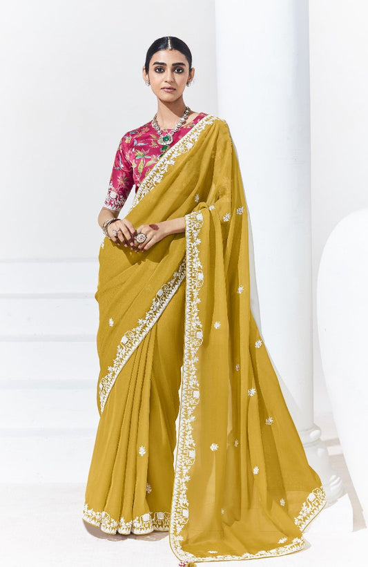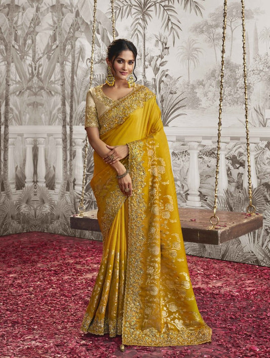 Festive Yellow Heavy Embroidered Designer Silk Saree