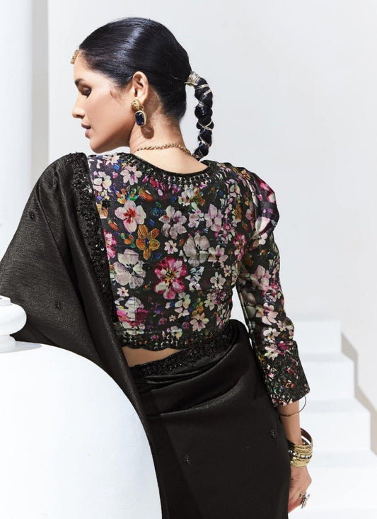 Ash Black Crush Tissue Silk Saree With Designer Blouse