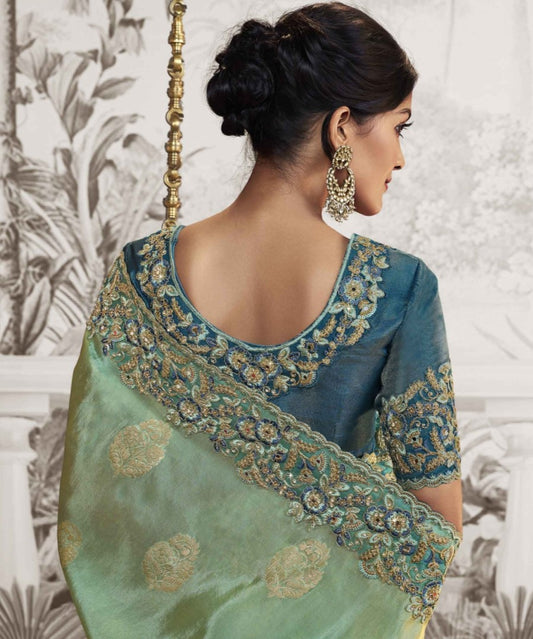 Mint Green & Blue Heavy Embroidered Designer Silk Saree