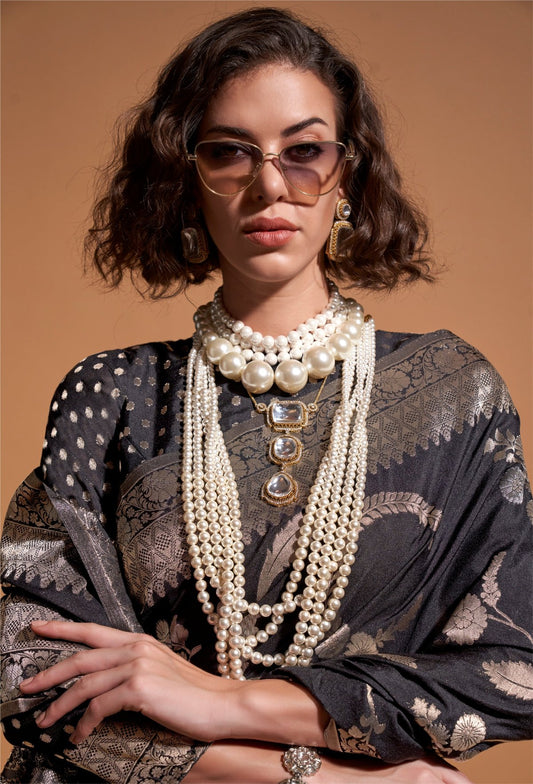Admiral Black Soft Silk Saree With Brocade Blouse