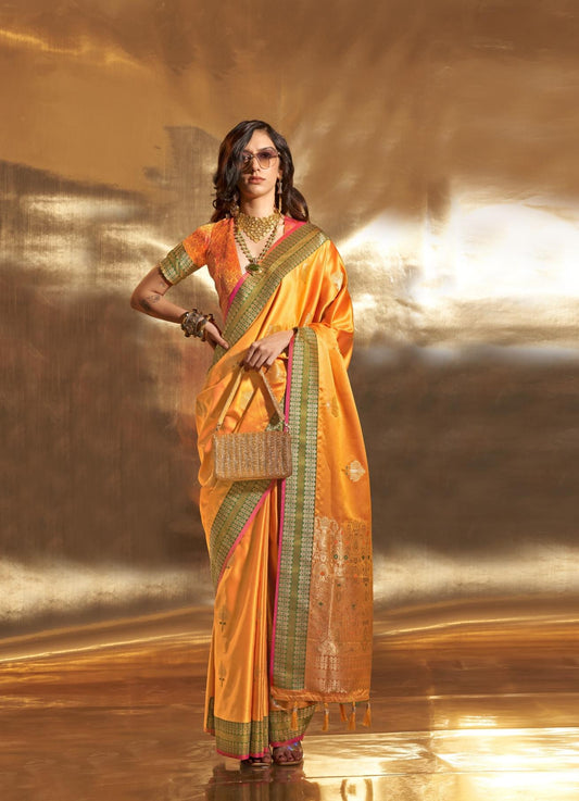 Turmeric Yellow Satin Silk Saree With Zari Motifs