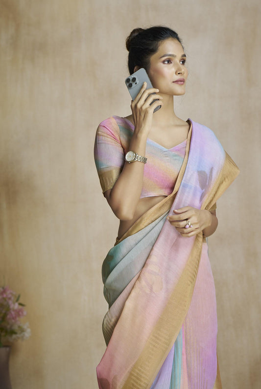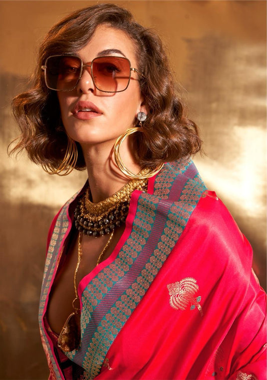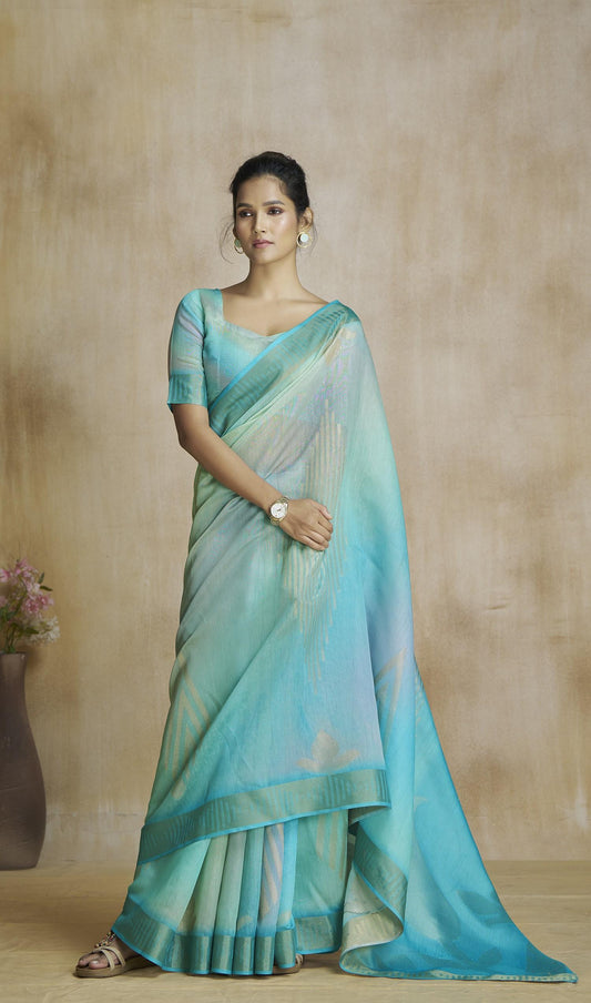Cerulean Blue Satin Silk Saree With Zari Motifs