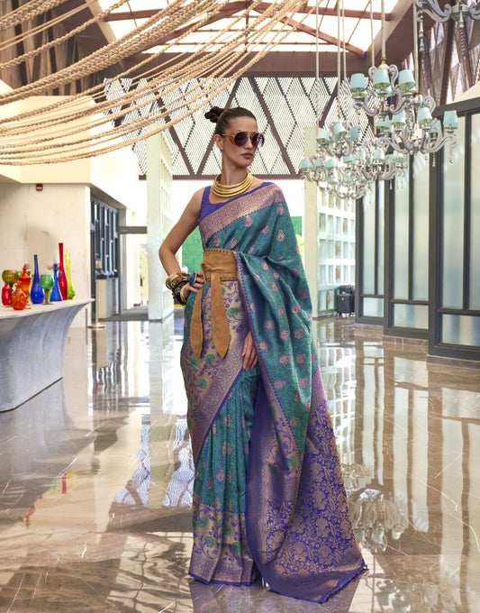 Green & Blue Zari Woven Broad Floral Border Handloom Silk Saree