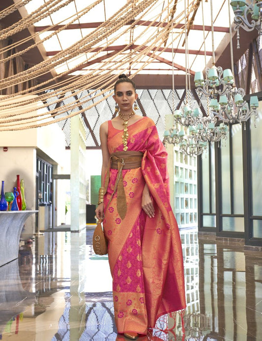 Bright Pink & Orange Zari Woven Broad Floral Border Handloom Silk Saree
