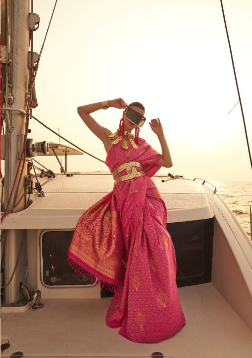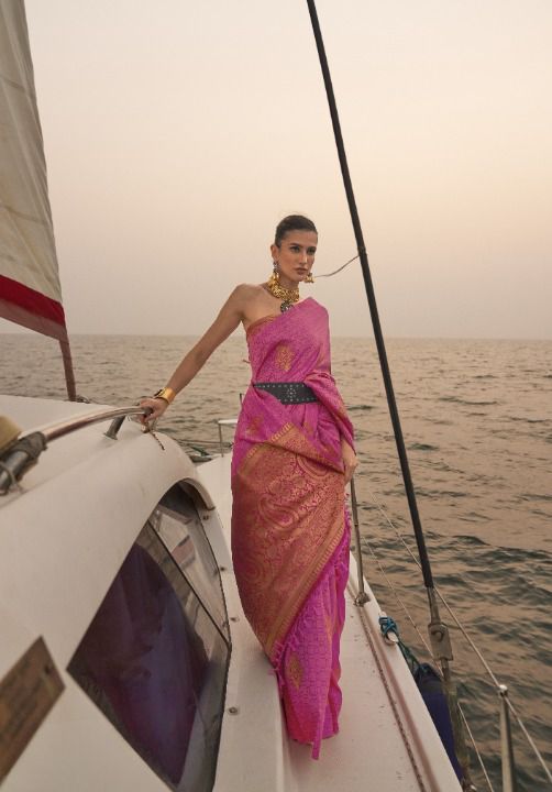 Bright Pink Zari Woven Broad Floral Border Handloom Silk Saree