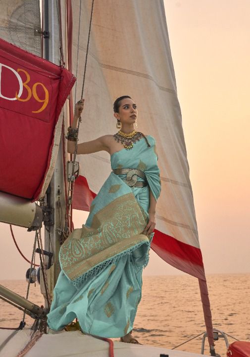 Aquamarine Blue Zari Woven Broad Floral Border Handloom Silk Saree