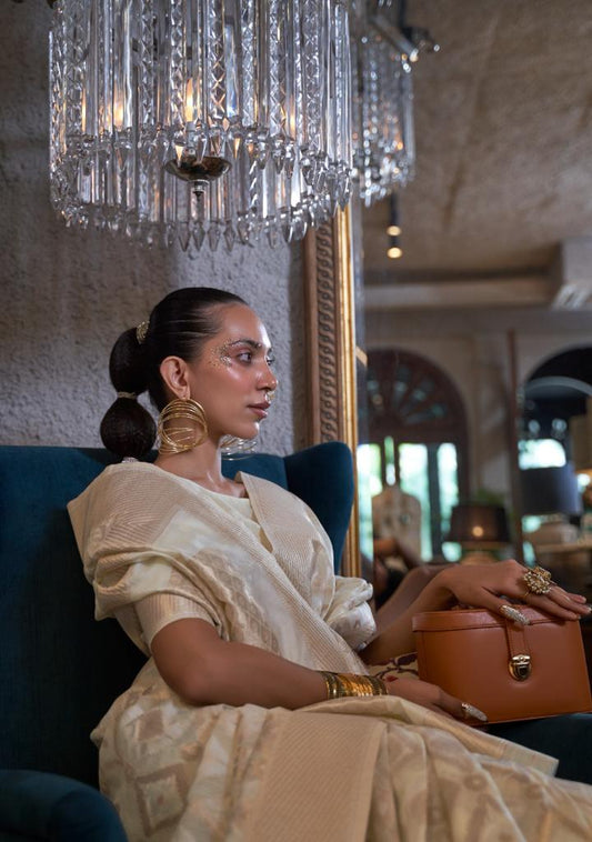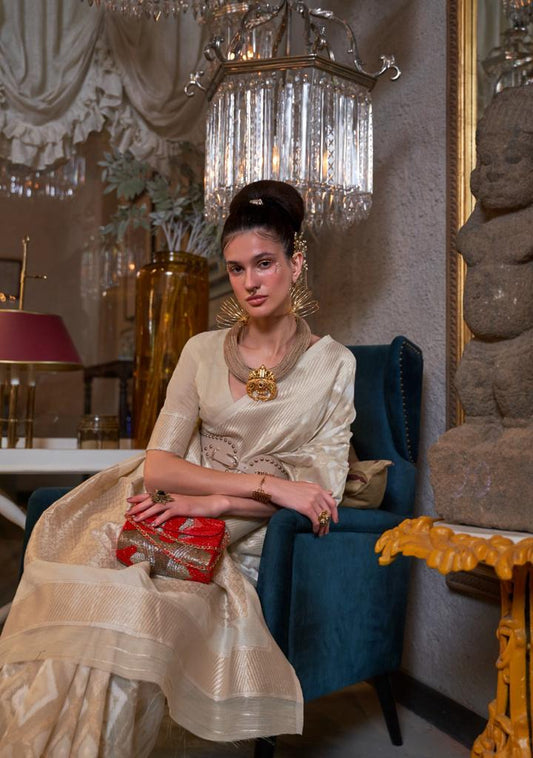 Ivory White Handloom Woven Linen Saree