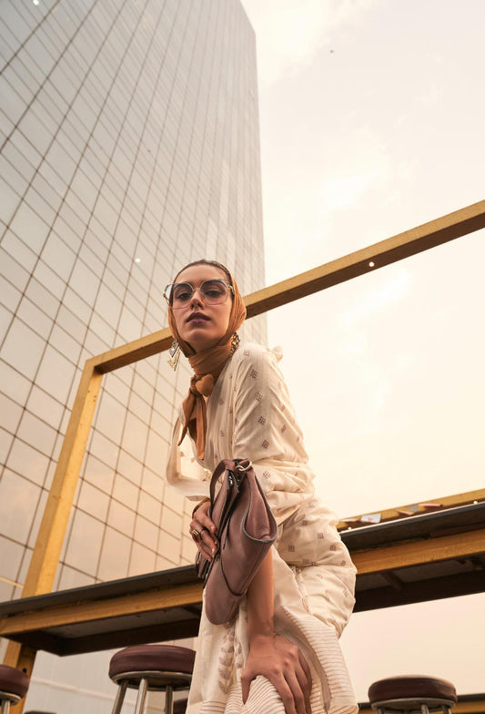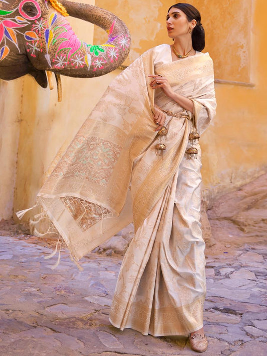 Off White Viscose Linen Handloom Saree With Handmade Tassels