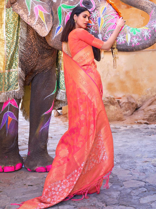 Carrot Red Banarasi Handloom Soft Silk Saree