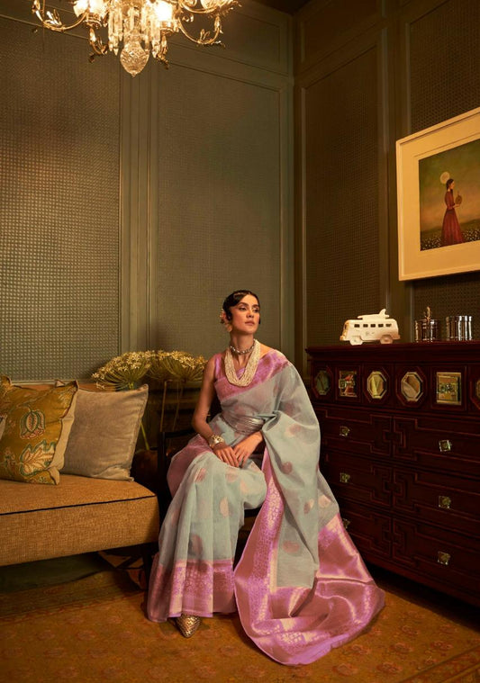 Pastel Blue Copper Zari Woven Linen Silk Saree