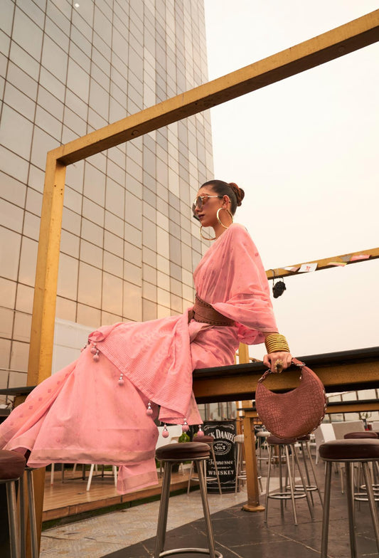 Rose Pink Viscose Linen Handloom Saree With Handmade Tassels