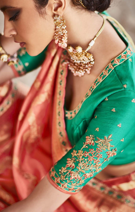 Apricot Peach Banarasi Silk Saree With Designer Blouse