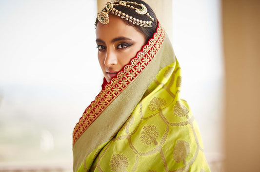 Lime Green Banarasi Silk Saree With Designer Blouse