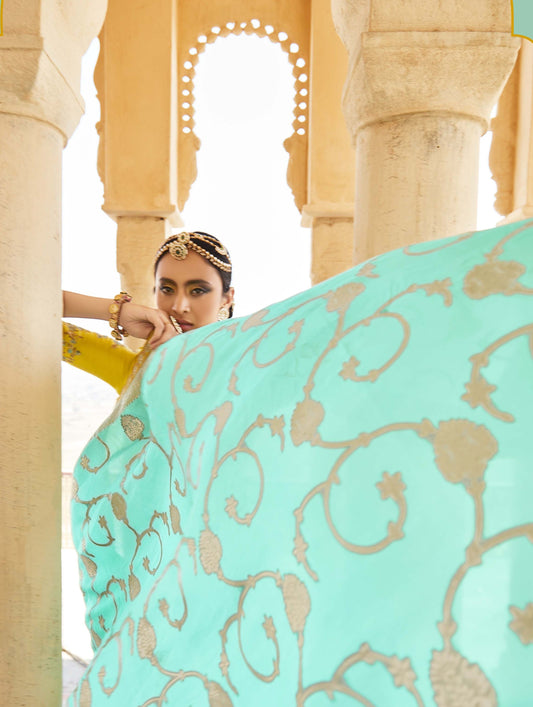 Pastel Turquoise Banarasi Silk Saree With Designer Blouse