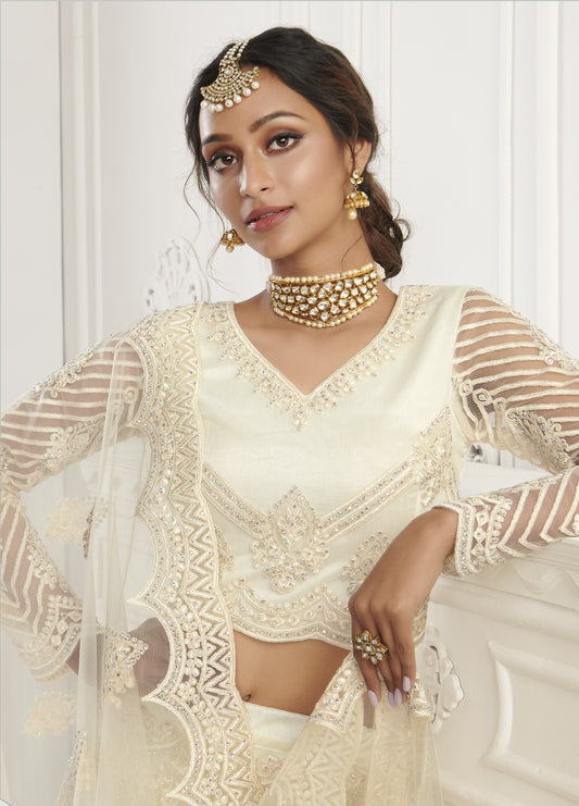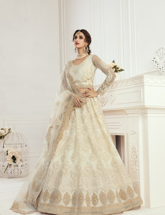 Ivory White Heavy Embroidered Net Bridal Lehenga