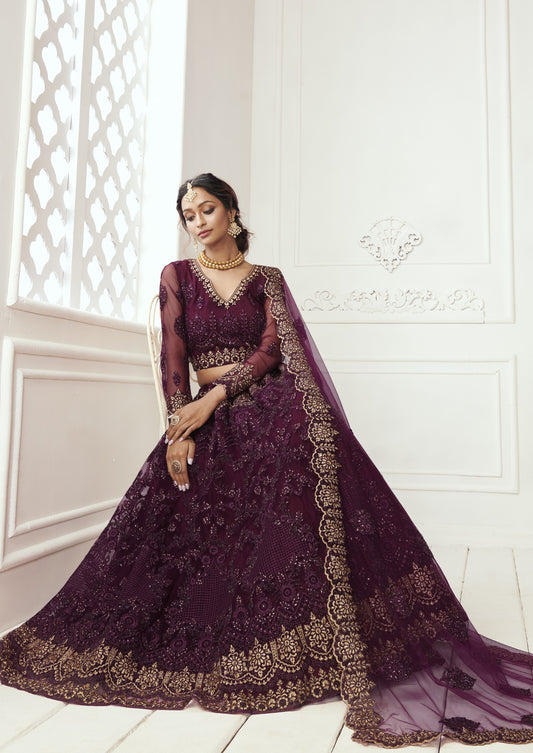 Grape Wine Heavy Embroidered Net Bridal Lehenga