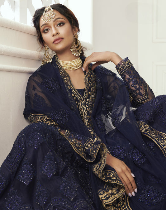 Navy Blue Heavy Embroidered Net Bridal Lehenga