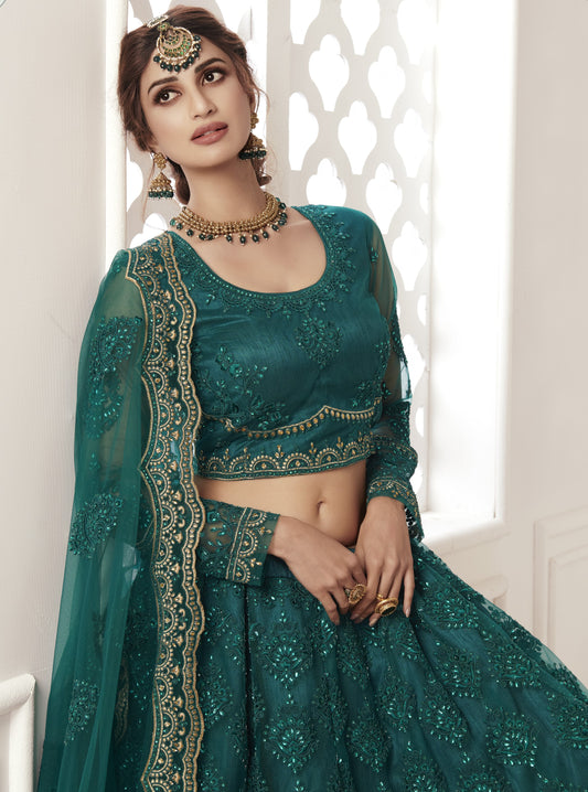 Teal Green Heavy Embroidered Net Bridal Lehenga
