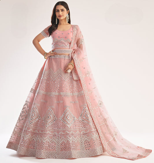 Powder Pink Heavy Embroidered Net Bridal Lehenga