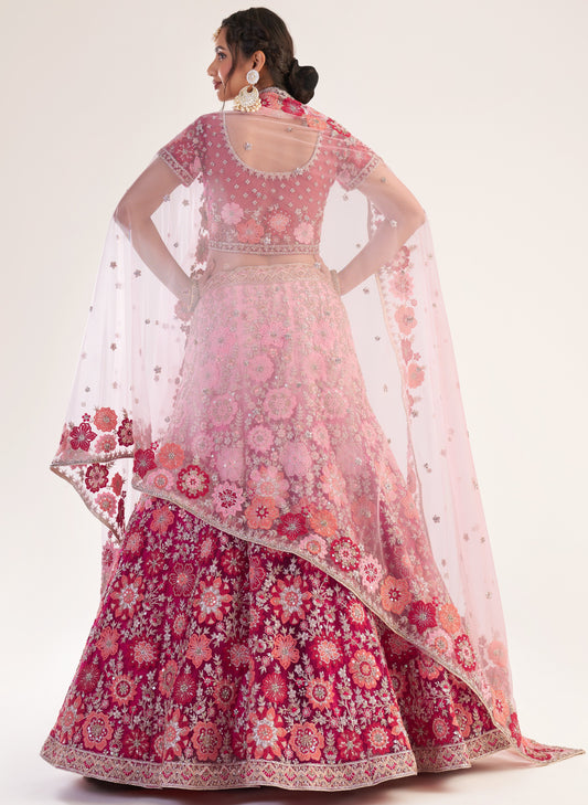 Magenta Pink Heavy Embroidered Net Bridal Lehenga