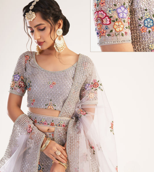 Dusky Lavendar Heavy Embroidered Net Bridal Lehenga