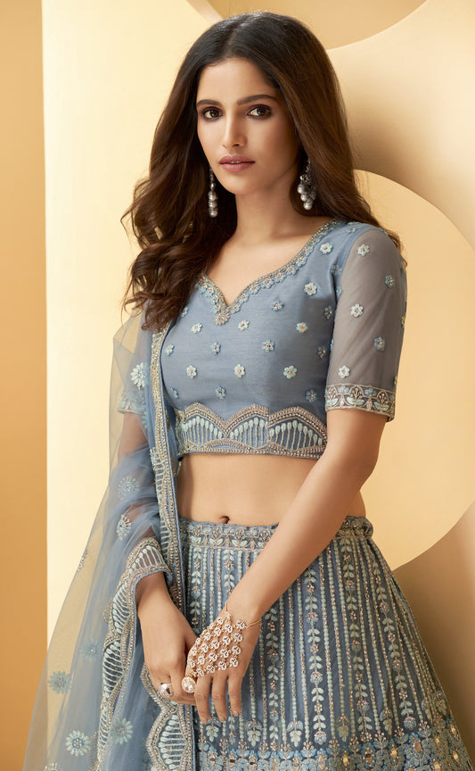 Slate Blue Heavy Embroidered Net Bridal Lehenga