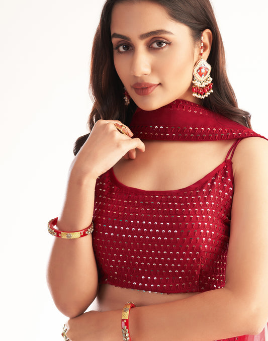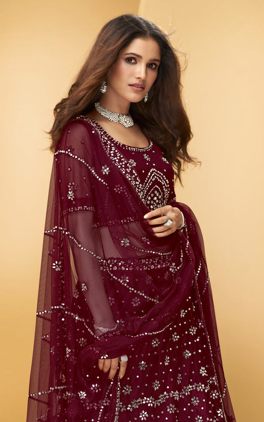 Marvel Maroon Heavy Mirror & Zarkan Work Designer Net Lehenga