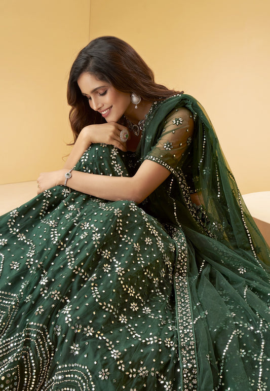 Emerald Green Heavy Mirror & Zarkan Work Designer Net Lehenga