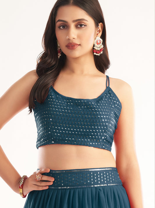 Berry Blue Heavy Mirror & Zarkan Work Designer Net Lehenga