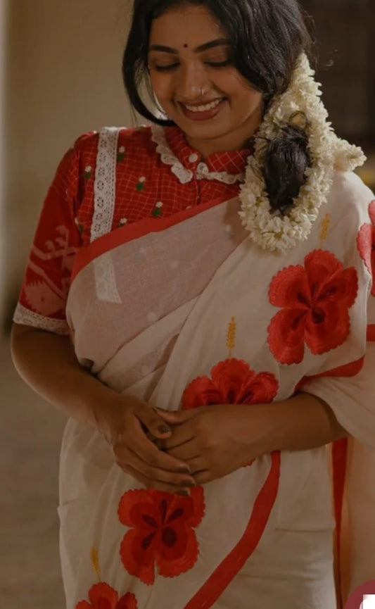Red & White Block Printed Handloom Cotton Mulmul Saree