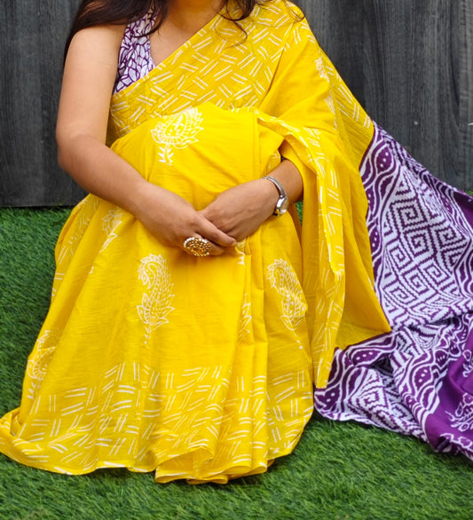 Yellow & Purple Handloom Cotton Mulmul Saree
