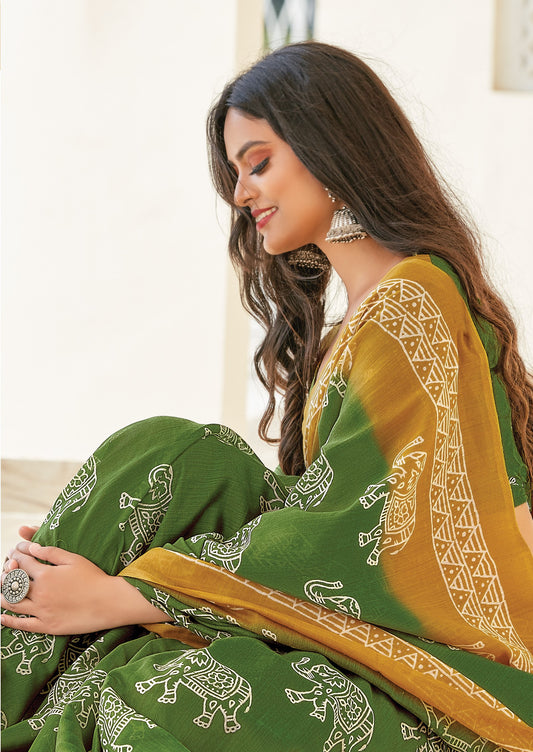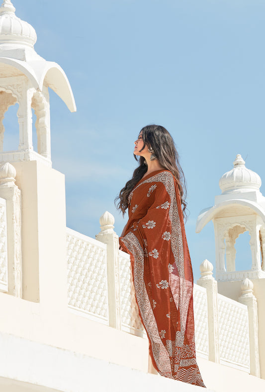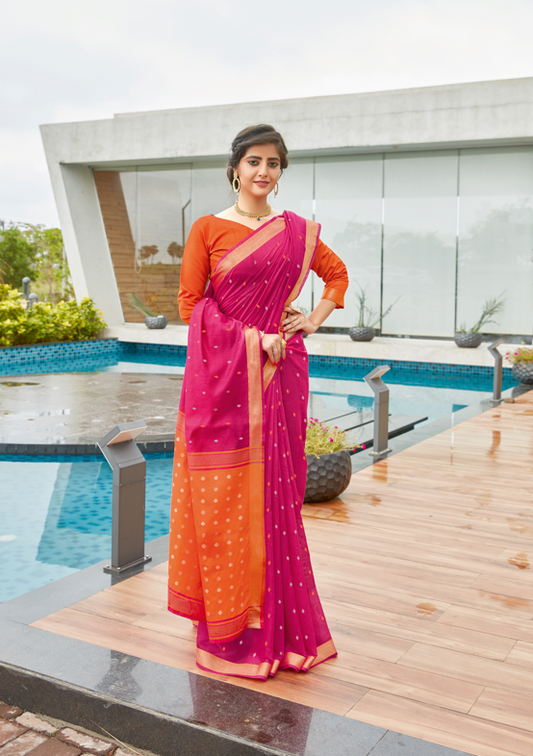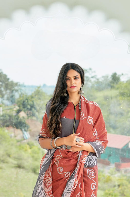 Bluish Grey & Orange Printed Handloom Cotton Saree