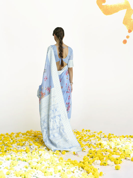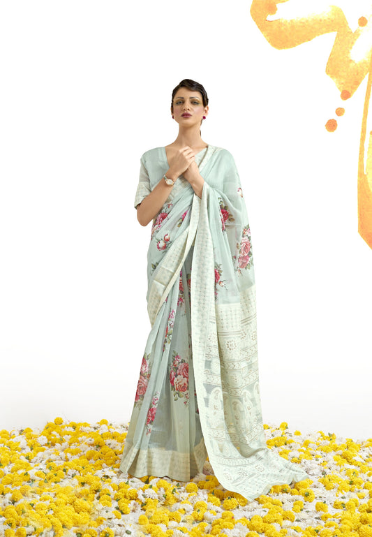 Powder Blue Floral Print Lucknowi Chikankari Saree