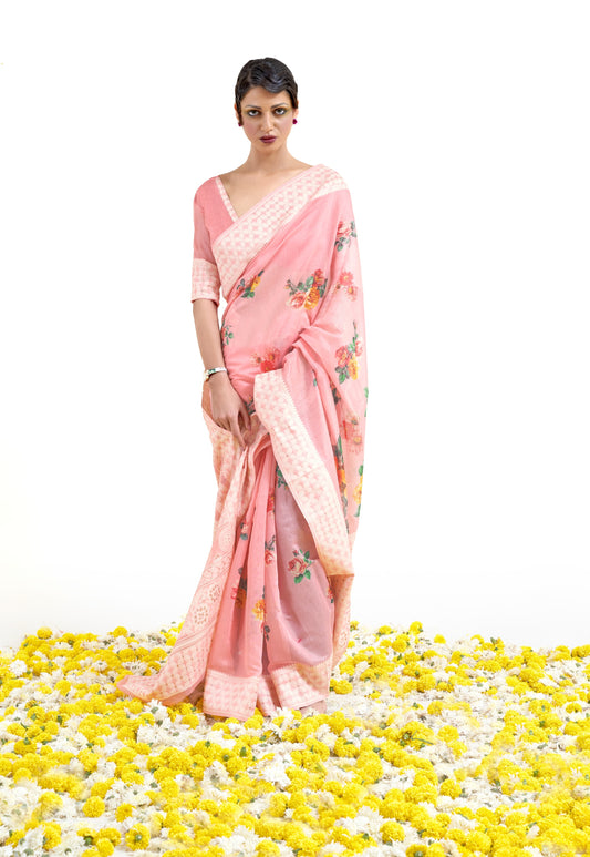 Lemonade Pink Floral Print Lucknowi Chikankari Saree
