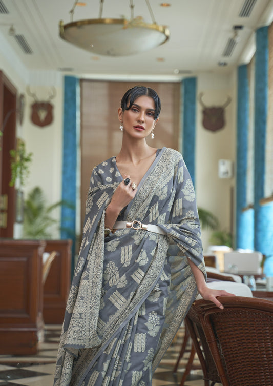 Jet Grey Weaved Lucknowi Chikankari Saree