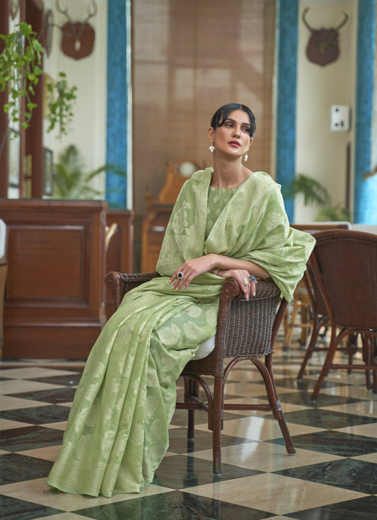 Pastel Olive Green Weaved Lucknowi Chikankari Saree