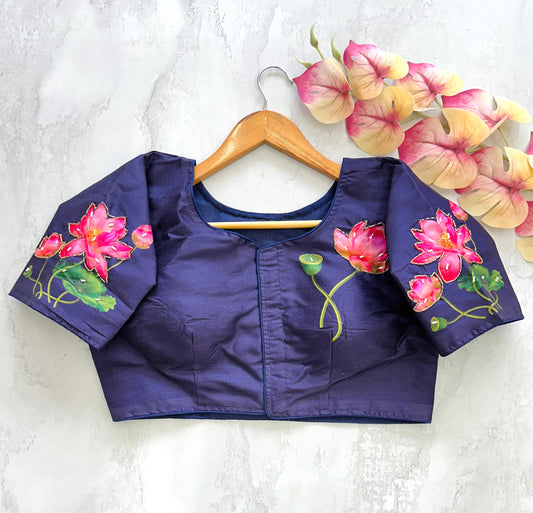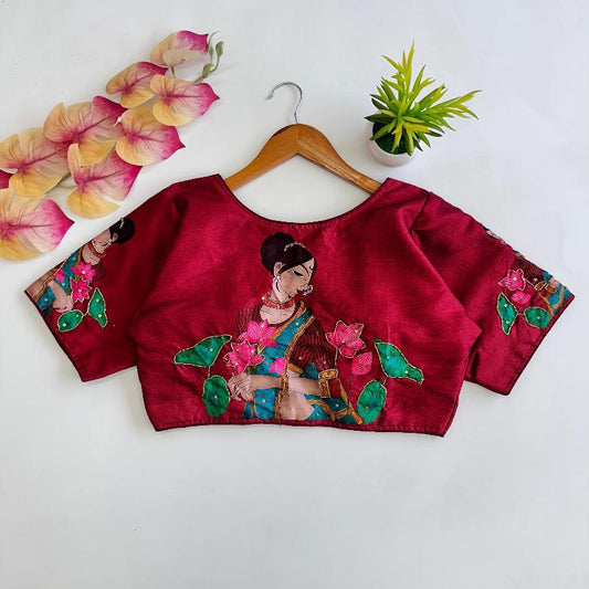 Pichwai Lotus Printed Raw Silk Blouse With Sequin Handwork