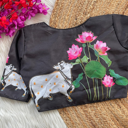Krutik Cow & Lotus Printed Pichwai Blouse With Sequins Handwork