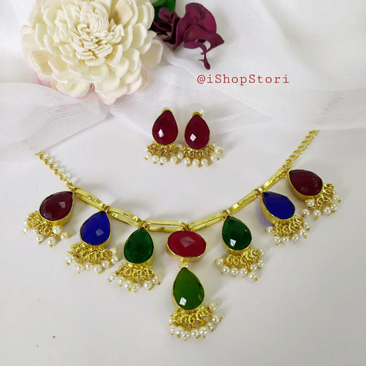 Aalekha Raw Stone Multi Color Claw Necklace Set