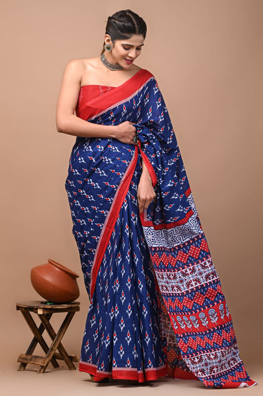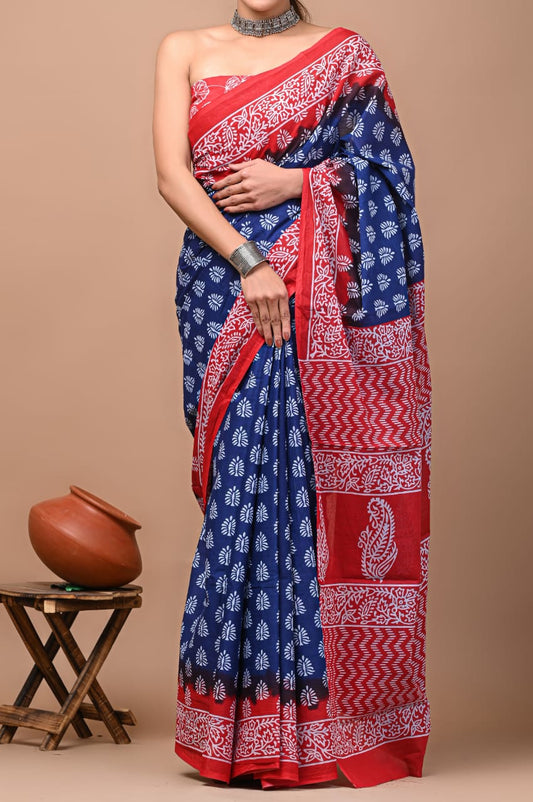 Indigo & Red Block Printed Handloom Cotton Mulmul Saree