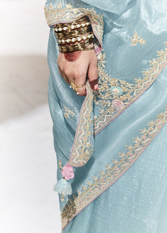 Pastel Blue Crush Tissue Silk Saree With Designer Blouse