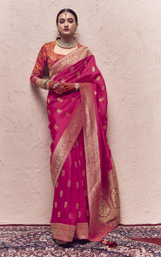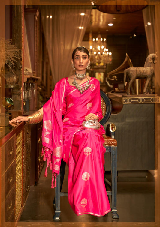 Fuschia Pink Satin Silk Saree With Carnation Dual Zari Motifs