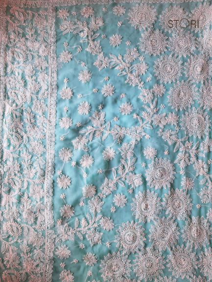 Sky Blue Surya Hand Embroidered Lucknowi Chikankari Saree