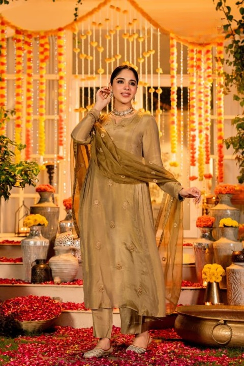 Elevate your ethnic wardrobe with this stunning Bronze Shimmer Silk Suit Set. Crafted from premium silk fabric, this ensemble features a luxurious bronze tone with subtle shimmer that catches light beautifully. Perfect for weddings, festivals, and special occasions, the set includes a perfectly tailored kurta and coordinating bottoms. The rich metallic sheen adds sophistication and glamour to your traditional look. Comfortable yet elegant, this suit set is ideal for those who appreciate quality craftsmanship and timeless style. A versatile piece that transitions seamlessly from celebrations to formal gatherings.